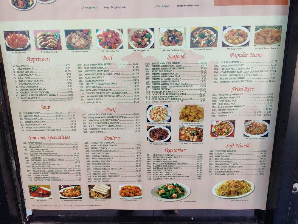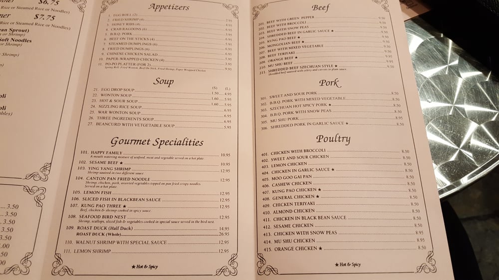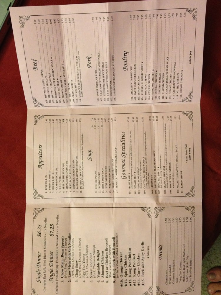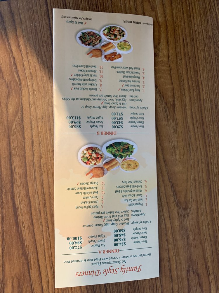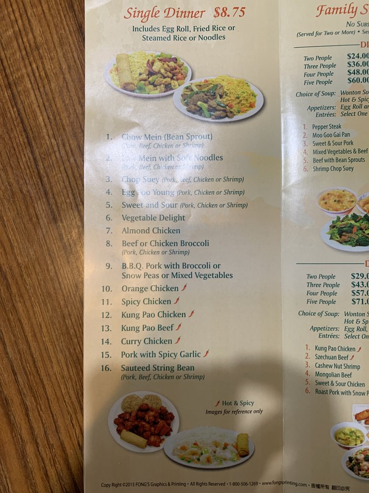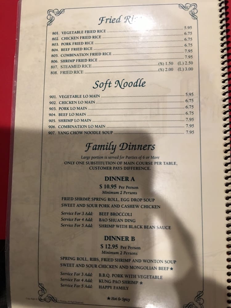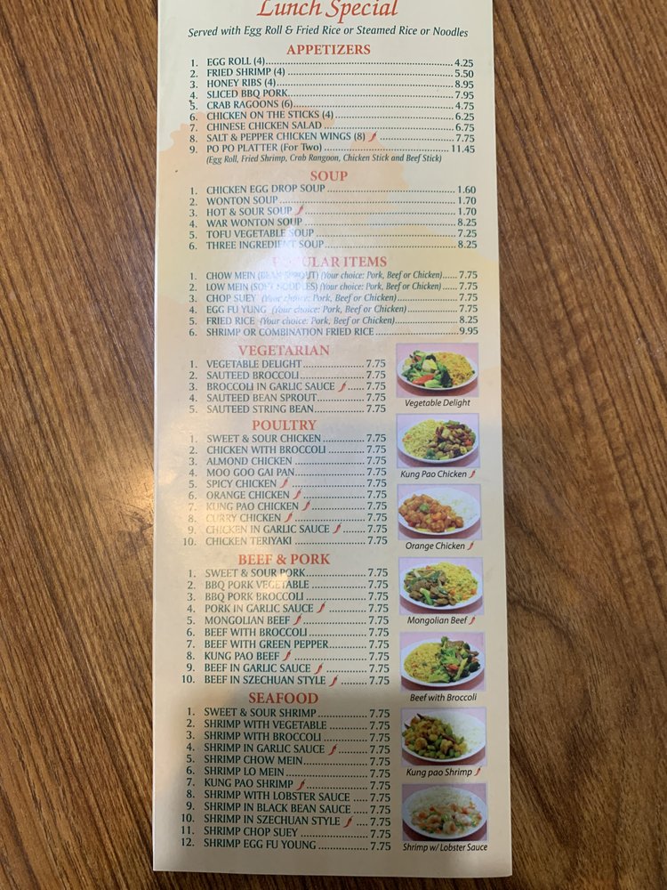 Includes egg roll, fried rice, steamed, or noodles. Pork, chicken.