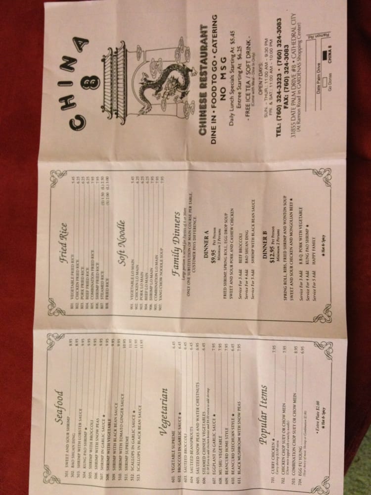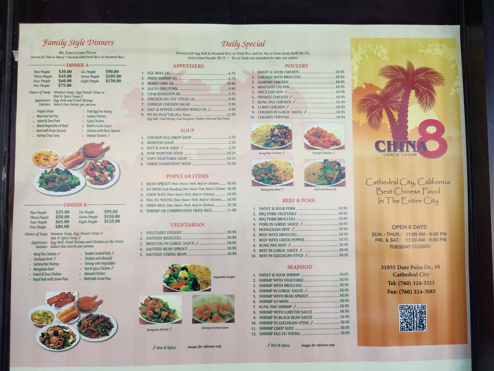 Introducing the menu at China 8 in Cathedral City, CA, a Chinese restaurant that offers a range of appetizers, soups, and soft noodles. Their appetizers include Egg Rolls, Fried Shrimp, Honey Ribs, and Crab Rangoons, perfect for starting your meal. For soup lovers, options like Egg Drop Soup, Wonton Soup, and Hot & Sour Soup are available. The soft noodles selection features dishes like Vegetable Lo Mein, Chicken Lo Mein, and Beef Chow Fun. Customers have praised the generous portions and flavorful dishes, with highlights like the Orange Chicken earning rave reviews for its tender chicken and tangy sauce. China 8 provides a casual dining experience with options for takeout, delivery, and catering, making it a great choice for delicious Chinese cuisine in the area.